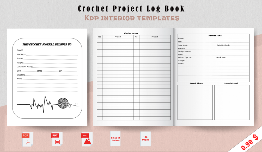 Download “Crochet Journal Log Book” instantly with PDF Ready to upload on KDP with PowerPoint source files for customization.