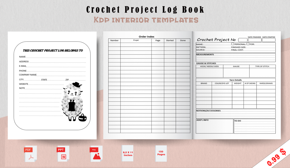 Download “Crochet Journal Log Book” instantly with PDF Ready to upload on KDP with PowerPoint source files for customization.
